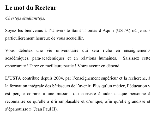l’Université Saint Thomas d’Aquin (USTA) est heureuse de vous accueillir sur son site institutionnel.